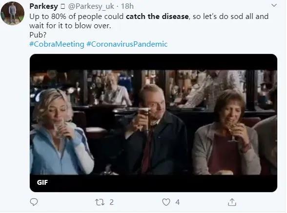還有英國網(wǎng)民苦中作樂地調(diào)侃說:80%的人都會感染病毒?那我們啥都不用做了,就等著一切都暴發(fā)起來吧~去酒吧不?
