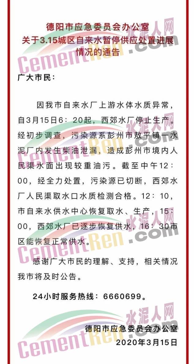 記者從3月15日17點(diǎn)召開的四川省德陽市政府新聞發(fā)布會上獲悉,3月15日凌晨,德陽市西郊水廠人民渠取水口水質(zhì)監(jiān)測顯示石油類指標(biāo)超標(biāo)。德陽市按照《德陽市突發(fā)環(huán)境事件應(yīng)急預(yù)案》啟動環(huán)境突發(fā)事件應(yīng)急預(yù)案,組織德陽、什邡執(zhí)法人員到達(dá)人民渠什邡市第三取水廠附近進(jìn)行調(diào)查,啟動應(yīng)急加密監(jiān)測。根據(jù)監(jiān)測情況,西郊水廠于3月15日6點(diǎn)30分暫停取水口取水,排空管內(nèi)進(jìn)水以確保已取水未流入生產(chǎn)水廠。