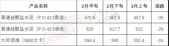 國(guó)家統(tǒng)計(jì)局流通領(lǐng)域重要生產(chǎn)資料市場(chǎng)價(jià)格變動(dòng)情況顯示自2月中旬開(kāi)工以來(lái),水泥及煤炭等價(jià)格下行。市場(chǎng)主流產(chǎn)品PO.42.5水泥均價(jià)跌幅在2%~3%。