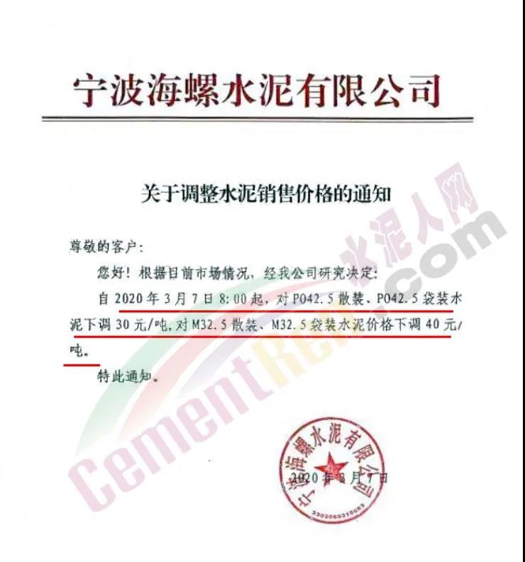 3月7日,浙江寧波主導(dǎo)企業(yè)通知,PO42.5散裝、PO42.5袋裝水泥下調(diào)30元/噸,M32.5散裝、M32.5袋裝水泥價(jià)格下調(diào)40元/噸。