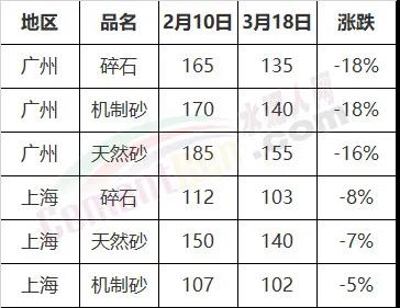 砂石方面,華南區(qū)域廣州區(qū)域礦石、機(jī)制砂、天然砂跌幅達(dá)16~18%。上海市砂石價(jià)報(bào)價(jià)較2月中旬跌幅在5%以上。
