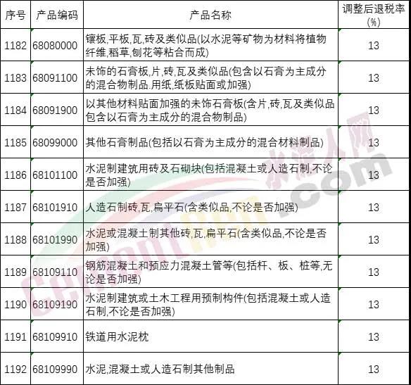 日前,國家財(cái)政部發(fā)布關(guān)于提高部分產(chǎn)品出口退稅率的公告,提高出口退稅率的產(chǎn)品清單中水泥,混凝土或人造石制其他制品等十余類產(chǎn)品調(diào)整后退稅率為13%,相關(guān)類如下: