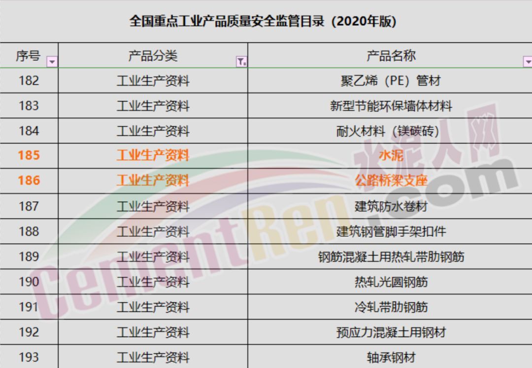 3月17日,國家市場監(jiān)督管理總局官網(wǎng)發(fā)布了《全國重點(diǎn)工業(yè)產(chǎn)品質(zhì)量安全監(jiān)管目錄(2020年版)》文件,要求抓好流通領(lǐng)域重點(diǎn)產(chǎn)品質(zhì)量安全監(jiān)管。特別是針對(duì)風(fēng)險(xiǎn)高、已出現(xiàn)區(qū)域性或行業(yè)性質(zhì)量安全問題苗頭的產(chǎn)品,要及時(shí)開展專項(xiàng)整治,多措并舉、綜合施策、嚴(yán)控險(xiǎn)情。水泥人網(wǎng)關(guān)注到,水泥、鋼筋等重點(diǎn)建筑材料物資位列其中。