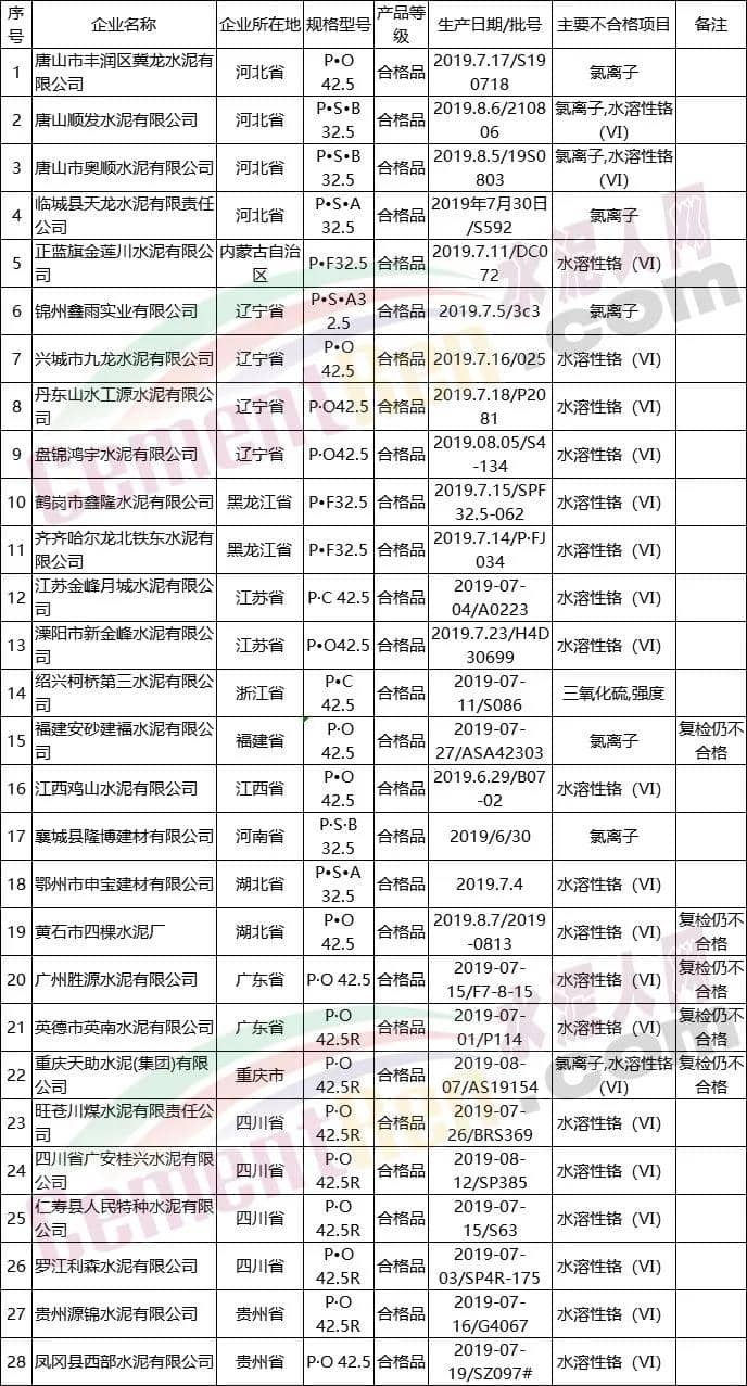 2019年12月市場監(jiān)管總局辦公廳發(fā)布《關(guān)于2019年童鞋等51種產(chǎn)品質(zhì)量國家監(jiān)督抽查情況的通報(bào)》。其中水泥抽查了30個(gè)省(區(qū)、市)349家企業(yè)生產(chǎn)的349批次水泥產(chǎn)品,其中30批次產(chǎn)品不合格,不合格發(fā)現(xiàn)率為8.6%。不合格項(xiàng)目涉及三氧化硫、氯離子、強(qiáng)度、水溶性鉻(Ⅵ)。