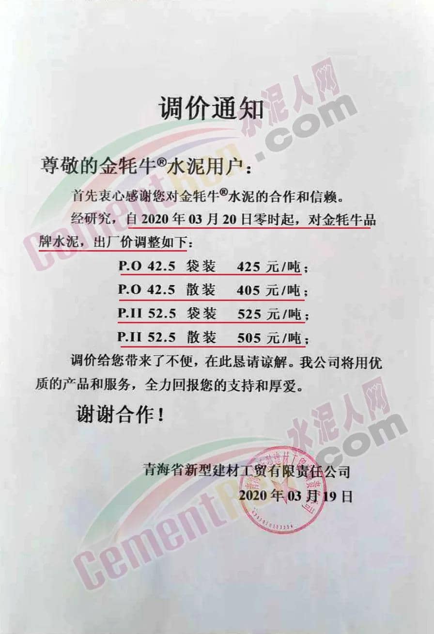 3月19日青海省新型建材工貿(mào)有限責(zé)任公司通知自3月20日零時(shí)起,對(duì)金牦牛品牌水泥出廠價(jià)進(jìn)行調(diào)整。PO42.5袋裝水泥425元/噸,散裝水泥執(zhí)行405元/噸;P.II52.5袋裝水泥執(zhí)行525元/噸,散裝水泥執(zhí)行505元/噸。