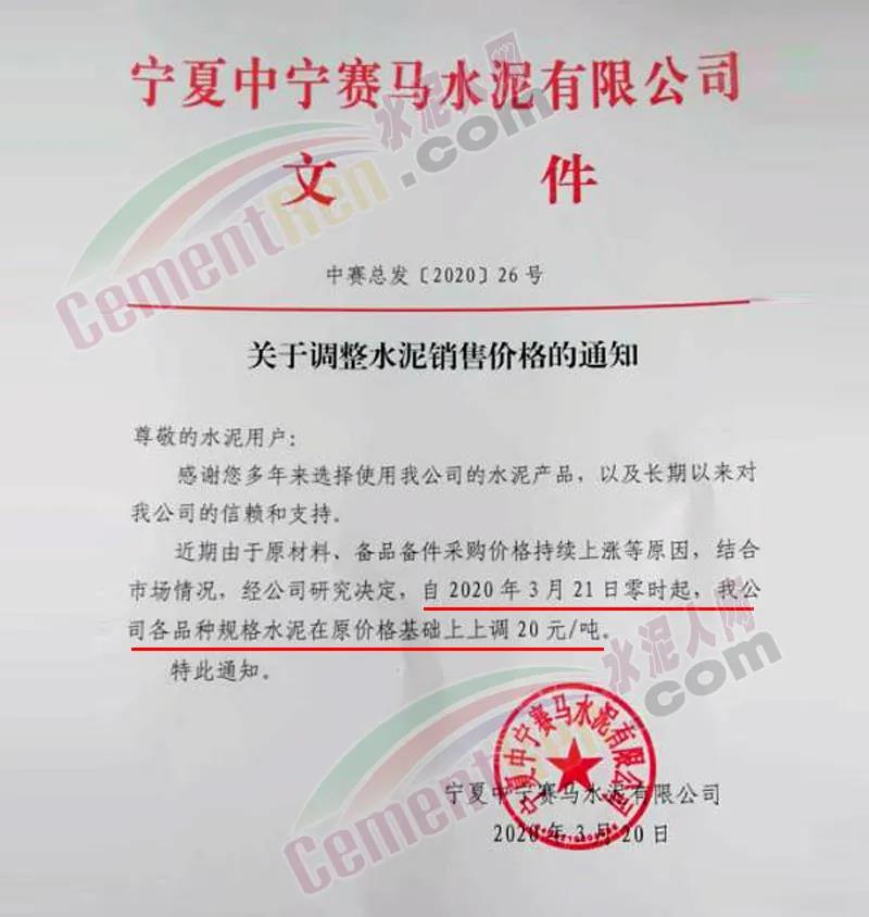 寧夏石嘴山賽馬水泥有限公司同一天通知上調(diào)各品種水泥價(jià)格20元/噸。