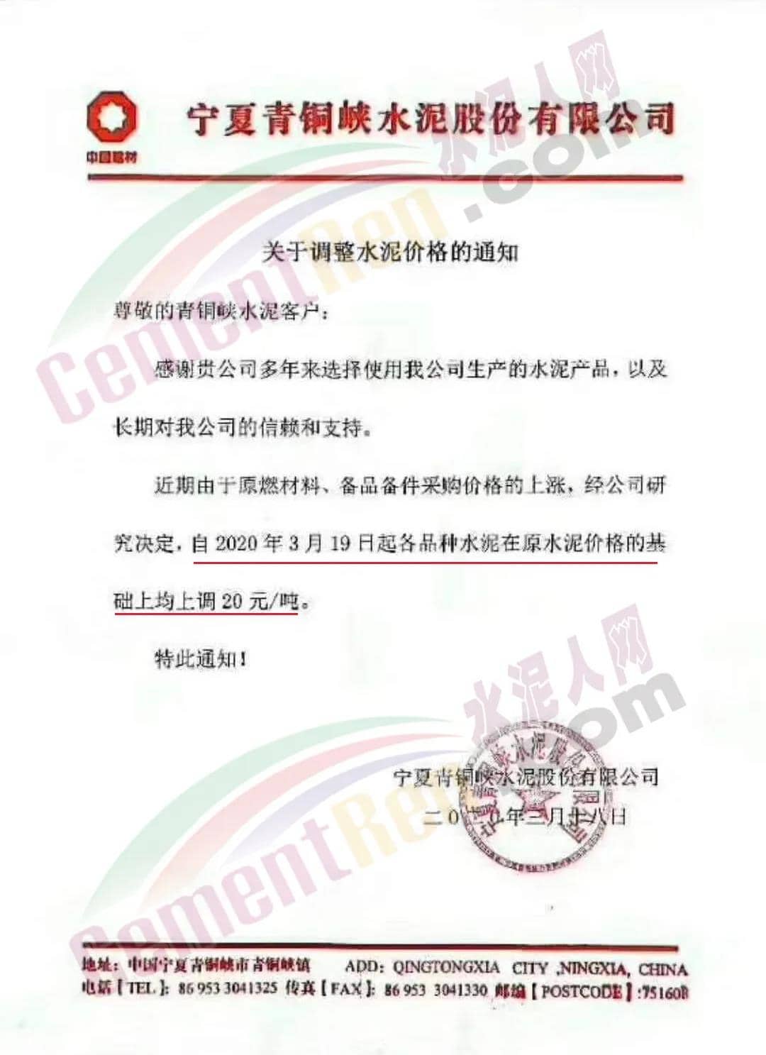 寧夏青銅峽水泥股份有限公司通知自3月19日起各品種水泥在原價(jià)基礎(chǔ)上上調(diào)20元/噸。