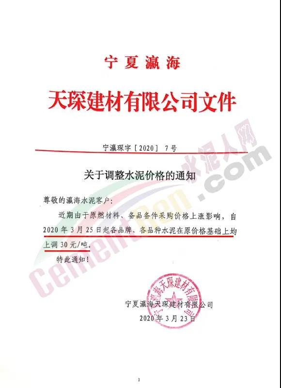 昨日(3月23日)寧夏瀛海天琛建材有限公司發(fā)布《關(guān)于調(diào)整水泥價格的通知》稱,近期由于原材料、備品備件采購價格上漲的影響,自2020年3月25日起,各品牌、各品種水泥在原價格基礎(chǔ)上均上調(diào)30元/噸。