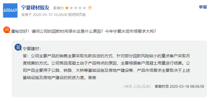 針對于近期的水泥市場需求,寧夏建材上市公司表示,公司主要產(chǎn)品的銷售主要采取先款后貨的方式,針對部分回款風(fēng)險較小的重點客戶采取月度結(jié)算的方式。公司商品混凝土由于產(chǎn)品特點的原因,主要根據(jù)客戶混凝土用量進(jìn)行結(jié)算。公司產(chǎn)品主要用于公路、鐵路、大橋等基礎(chǔ)設(shè)施及房地產(chǎn)建設(shè)等,產(chǎn)品市場需求主要取決于上述基礎(chǔ)設(shè)施及房地產(chǎn)建設(shè)的投資力度。