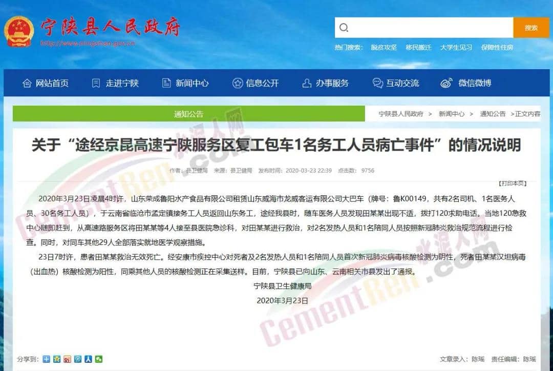寧陜縣3月23日發(fā)布的《關于“途徑京昆高速寧陜服務區(qū)復工包車1名復工人員病亡事件”的情況說明》顯示,涉事大巴車系山東榮成魯陽水產食品有限公司向山東威海市龍威客運有限公司租賃的,車上除兩名司機及一名醫(yī)務人員外,共乘坐30名務工人員,系從云南臨滄市接務工人員返回山東,途經寧陜縣時因醫(yī)務人員發(fā)現田某身體不適,遂撥打120求助。