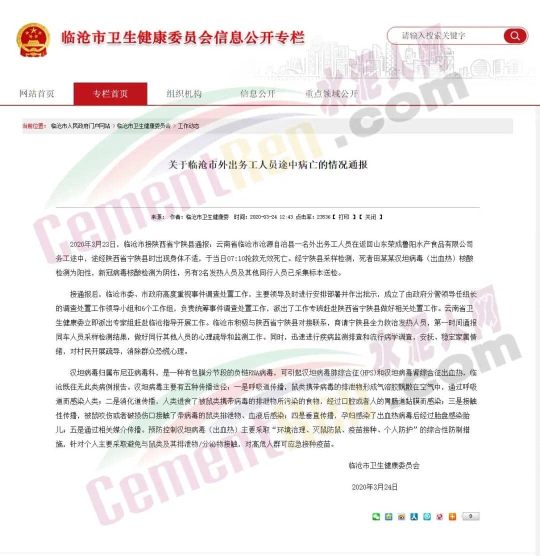 3月24日云南臨滄市健康委員會發(fā)布《關于臨滄市外出務工人員途中病亡情況的通報》稱,云南省臨滄市滄源自治縣一名外出務工人員在返回山東榮成魯陽水產食品有限公司務工途中,途經陜西省寧陜縣時出現身體不適,于當日07:10搶救無效死亡。經寧陜縣采樣檢測,死者田某某漢坦病毒(出血熱)核酸檢測為陽性,新冠病毒核酸檢測為陰性,另有2名發(fā)熱人員及其他同行人員已采集標本送檢。