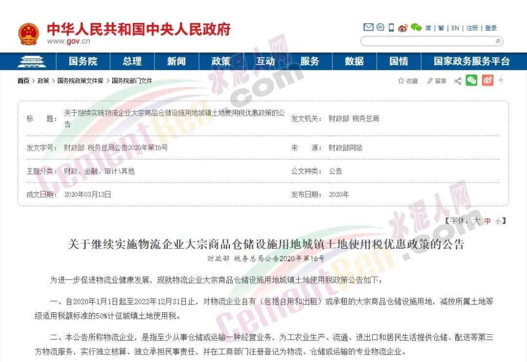 公告稱,自2020年1月1日起至2022年12月31日止,對(duì)物流企業(yè)自有(包括自用和出租)或承租的大宗商品倉(cāng)儲(chǔ)設(shè)施用地,減按所屬土地等級(jí)適用稅額標(biāo)準(zhǔn)的50%計(jì)征城鎮(zhèn)土地使用稅。
