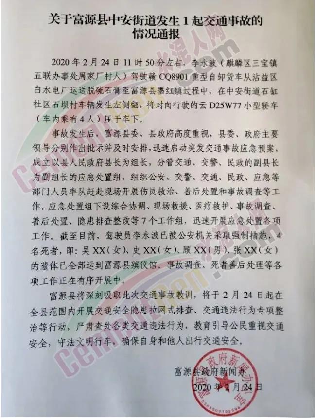 事故發(fā)生后,富源縣委、縣政府高度重視,縣委、政府主要領(lǐng)導(dǎo)分別作出批示并及時安排,迅速啟動突發(fā)交通事故應(yīng)急預(yù)案成立以縣人民政府縣長為組長,分管交通、交警、民政的副縣長為副組長的應(yīng)急處置組,組織公安、交警、交通、民政、應(yīng)急等部門人員率隊(duì)趕赴現(xiàn)場開展傷員救治、善后處置和事故調(diào)查等工作。應(yīng)急處置組下設(shè)綜合協(xié)調(diào)、現(xiàn)場救援、醫(yī)療救護(hù)、事故調(diào)查、善后處置、隱患排査整改等7個工作組,迅速開展應(yīng)急處置各項(xiàng)工作。截至目前,駕駛員李永波已被公安機(jī)關(guān)采取強(qiáng)制措施,4名死者,即:吳XX(女)、史XX(女)、顧XX(男)、張XX(女)的遺體全部運(yùn)到富源縣殯儀館。