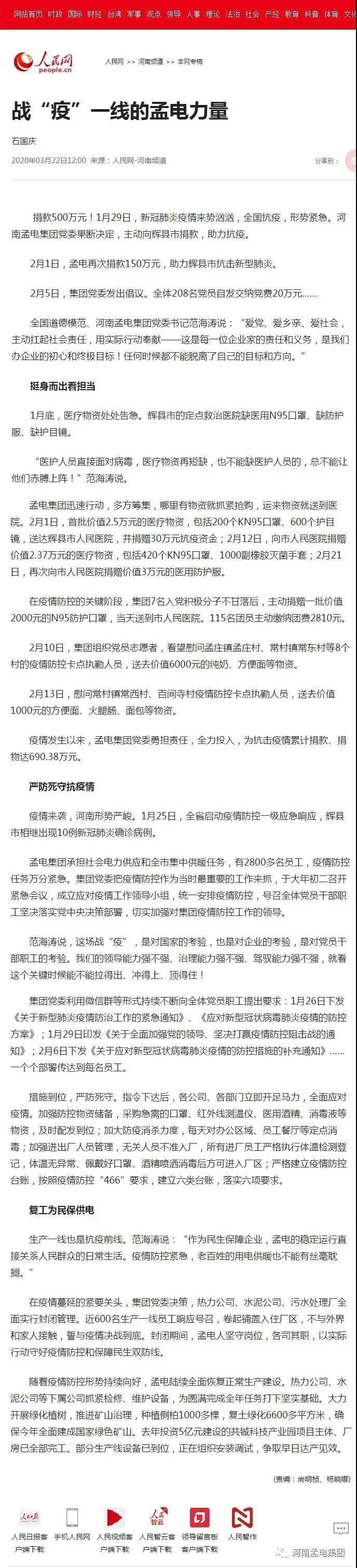 (3月22日,人民網(wǎng)記者撰文對(duì)孟電集團(tuán)面對(duì)疫情、主動(dòng)作為的事跡進(jìn)行了報(bào)道。)