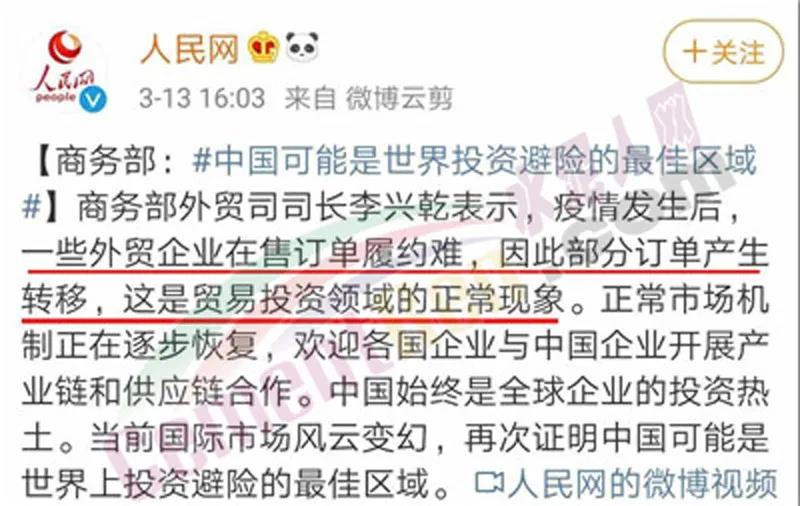 其實(shí),早在中國(guó)疫情最嚴(yán)重的時(shí)候,由于外貿(mào)企業(yè)停工,無(wú)法按期交付訂單,已經(jīng)導(dǎo)致部分訂單轉(zhuǎn)移到了其它國(guó)家。國(guó)家商務(wù)部門(mén)也注意到這個(gè)問(wèn)題,并表示這是正常的現(xiàn)象。