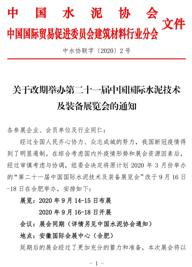 經(jīng)過全國人民齊心協(xié)力、眾志成城的努力,我國新冠疫情得到了明顯遏制。在綜合考慮國內(nèi)外疫情形勢和展會資源因素后,經(jīng)過審慎考慮與協(xié)調(diào),組委會決定將原計劃 2020 年 3 月份舉辦的“第二十一屆中國國際水泥技術(shù)及裝備展覽會”改于 9 月 16 日 -18 日在合肥舉辦,安排如下: