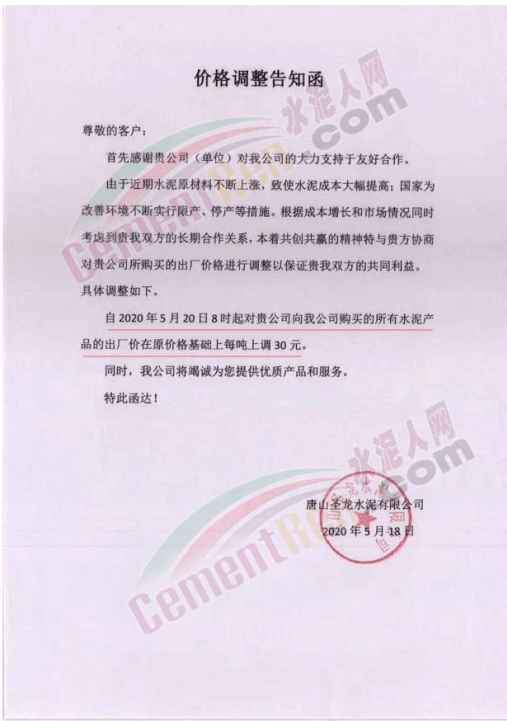 5月18日,唐山圣龍水泥有限公司通知,根據(jù)市場(chǎng)變化情況,國(guó)家為改善環(huán)境不斷實(shí)行限產(chǎn)、停產(chǎn)等措施,自2020年5月20日8時(shí)起所有水泥產(chǎn)品的出廠價(jià)格在原價(jià)格基礎(chǔ)上每噸上調(diào)30元。