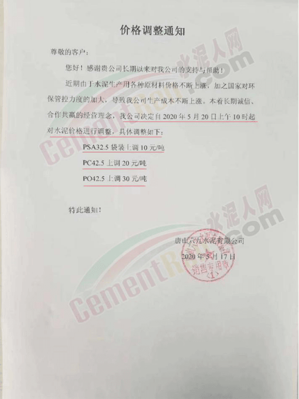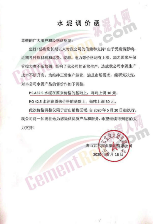 5月16日,唐山京東實(shí)業(yè)集團(tuán)有限公司通知,根據(jù)市場(chǎng)變化情況,自2020年5月20日起,P.S.A32.5水泥在原來價(jià)格的基礎(chǔ)上,每噸上調(diào)10元,P.O42.5水泥在原來價(jià)格的基礎(chǔ)上,每噸上調(diào)30元。