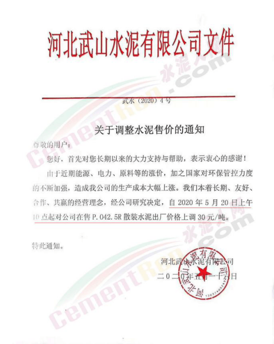 5月16日,河北武山水泥有限公司通知,根據(jù)市場(chǎng)變化情況,能源、電力、原料等的漲價(jià),自2020年5月20日上午10點(diǎn)起,P.042.5R散裝水泥出廠價(jià)格上調(diào)30元/噸。