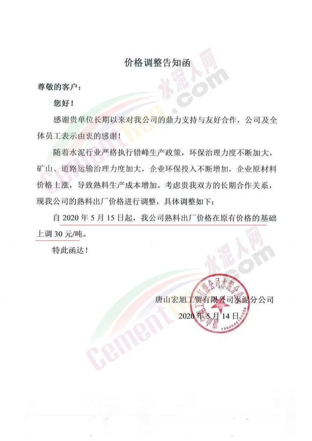5月14日,唐山宏旭工貿(mào)有限公司水泥分公司發(fā)布通知稱:隨著水泥行業(yè)嚴(yán)格執(zhí)行錯(cuò)峰生產(chǎn)政策,環(huán)保治理力度不斷加大,礦山、道路運(yùn)輸治理力度加大,企業(yè)環(huán)保投入不斷增加,企業(yè)原材料價(jià)格上漲,導(dǎo)致熟料生產(chǎn)成本增加。自2020年5月15日起,水泥出廠價(jià)格在原有價(jià)格的基礎(chǔ)上調(diào)30元/噸。