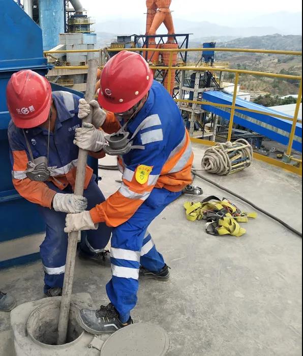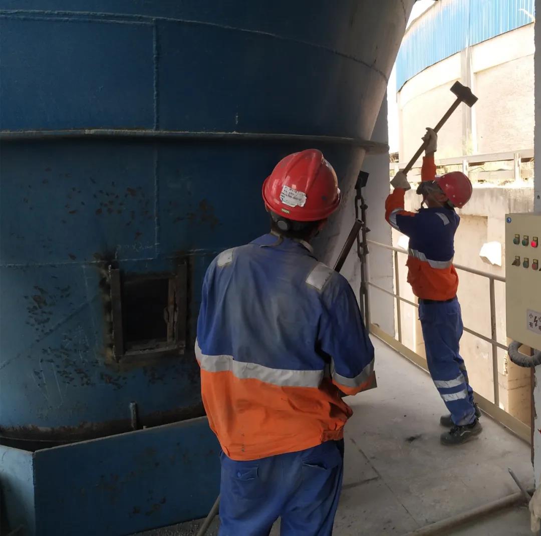 清庫前,大家制定好安全監(jiān)管制度、應(yīng)急預(yù)案,在作業(yè)現(xiàn)場(chǎng)認(rèn)真做了風(fēng)險(xiǎn)評(píng)估,辦理作業(yè)許可,嚴(yán)格按照LOTOTO程序9步驟進(jìn)行了操作,對(duì)庫外邊堆料區(qū)域進(jìn)行警示隔離。由于清庫作業(yè)屬于高風(fēng)險(xiǎn)作業(yè),為了降低風(fēng)險(xiǎn),大家輪番作業(yè),先使用大錘從庫錐鋼板倉外部進(jìn)行敲擊,使用長鋼釬、架管從庫頂測(cè)量孔、下料口對(duì)庫壁物料進(jìn)行清理,清除松動(dòng)物料。然后系上安全帶站在梯子上,用風(fēng)鎬對(duì)掛壁頑固的物料進(jìn)行清理,庫內(nèi)物料清下來后順著庫下邊的外接溜子輸送到外邊空地上。在清庫現(xiàn)場(chǎng),大家充分發(fā)揚(yáng)吃苦耐勞、精誠團(tuán)結(jié)的工作作風(fēng),經(jīng)過4天的共同努力,順利地完成了兩個(gè)庫的清料任務(wù)。生料系統(tǒng)清庫工作的順利完成,不僅讓大家積累了清庫作業(yè)經(jīng)驗(yàn),同時(shí)為后期生產(chǎn)的穩(wěn)定運(yùn)行奠定了堅(jiān)實(shí)基礎(chǔ)。