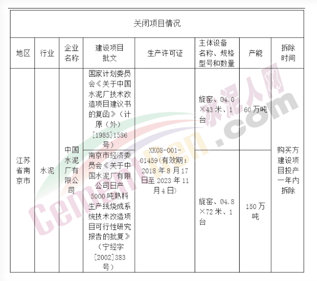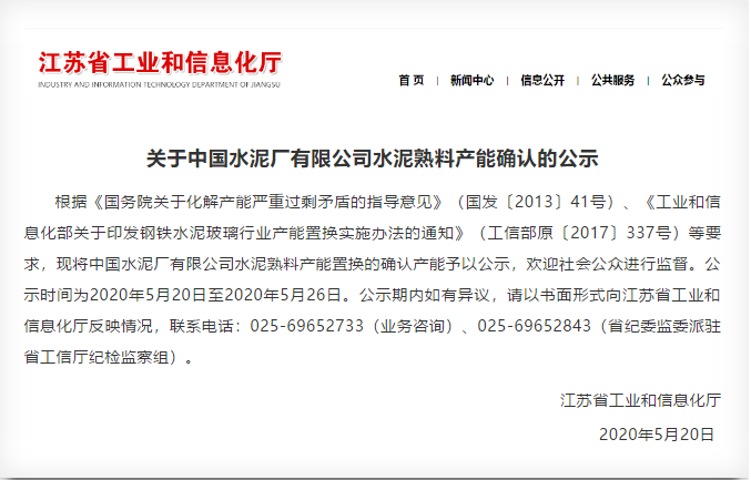 日前,江蘇省工信廳發(fā)布《關(guān)于中國水泥廠有限公司水泥熟料產(chǎn)能確認(rèn)的公示》將中國水泥廠共210萬噸/年產(chǎn)能置換出讓,且提出購買方建設(shè)項(xiàng)目投產(chǎn)一年內(nèi)拆除。公示原文如下:
