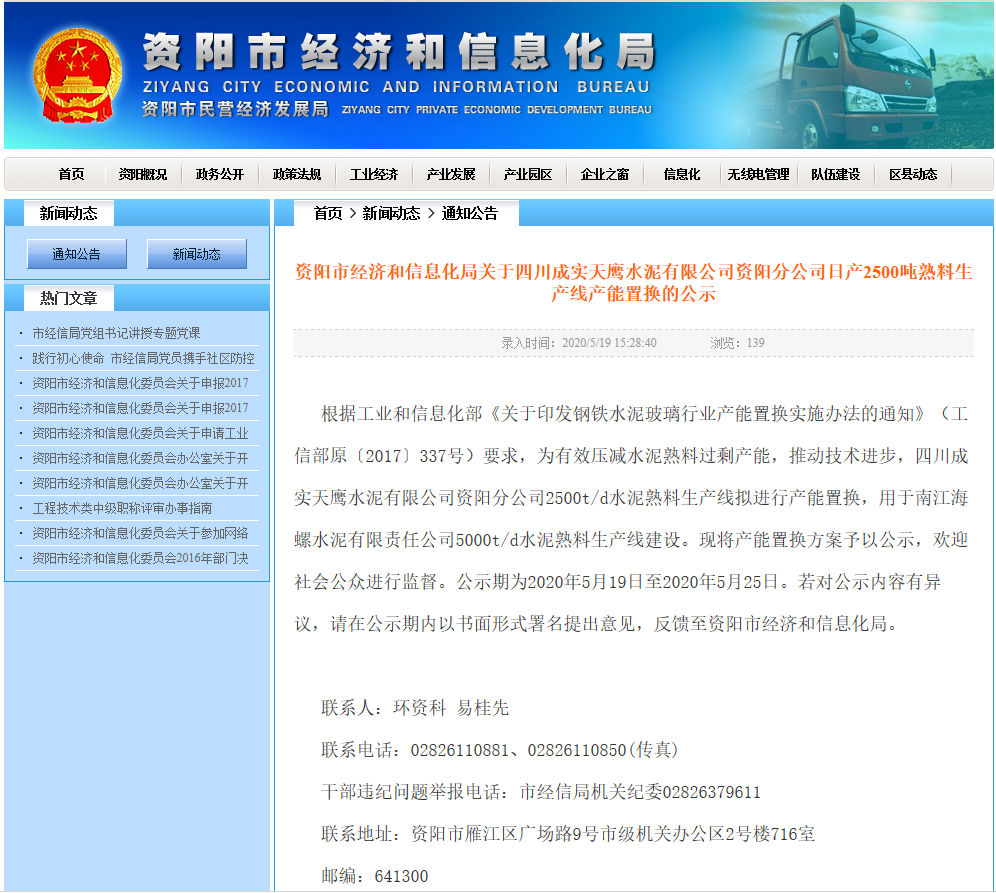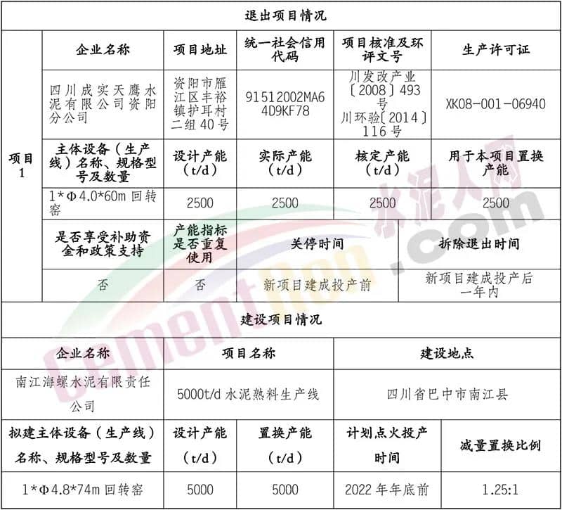 據(jù)水泥人網(wǎng)了解,日前,四川省資陽市經(jīng)濟(jì)和信息化局發(fā)布《關(guān)于四川成實(shí)天鷹水泥有限公司資陽分公司日產(chǎn)2500噸熟料生產(chǎn)線產(chǎn)能置換的公示》稱海螺水泥擬在四川省巴中市南江縣建設(shè)一條5000t/d水泥熟料生產(chǎn)線。公示全文如下: