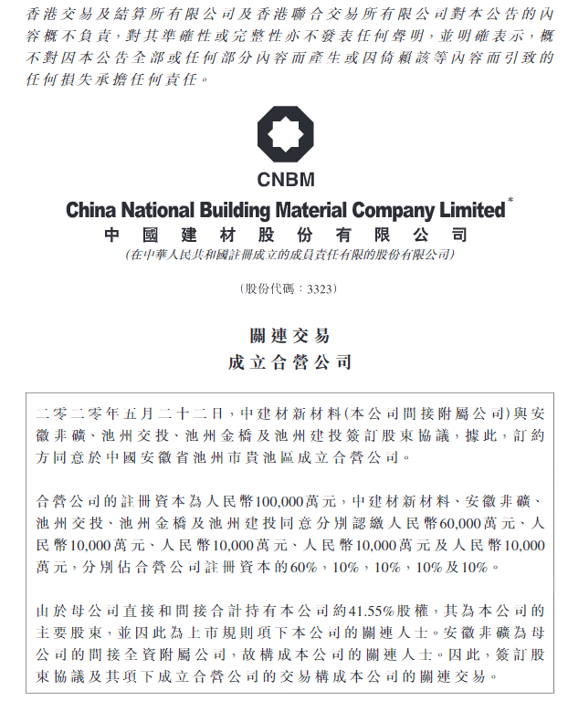 中國建材(03323)發(fā)布公告,2020年5月22日,該公司間接附屬公司中建材新材料與安徽非礦、池州交投、池州金橋及池州建投簽訂股東協(xié)議,訂約方同意于中國安徽省池州市貴池區(qū)成立合營公司。