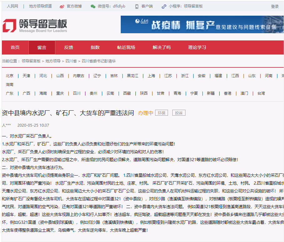 其留言稱,四川省星船城水泥公司、天鷹水泥公司、東方紅水泥公司以及周邊大大小小的采石廠礦石廠企業(yè)負(fù)責(zé)人在司機(jī)材料運(yùn)輸過程中嚴(yán)重失職,并且對公共設(shè)施的破壞!幾乎所有水泥廠和所有礦石廠沒有督促大貨車司機(jī),大貨車在運(yùn)輸過程中對國道321(資中縣段),對歸沙路(漁溪鎮(zhèn)至鐵佛鎮(zhèn)段),對板鋪路(板栗婭至新橋鎮(zhèn)段)造成的噪聲擾民、空氣擾民,對道路周圍的空氣污染,對國道321等道路的嚴(yán)重破壞!