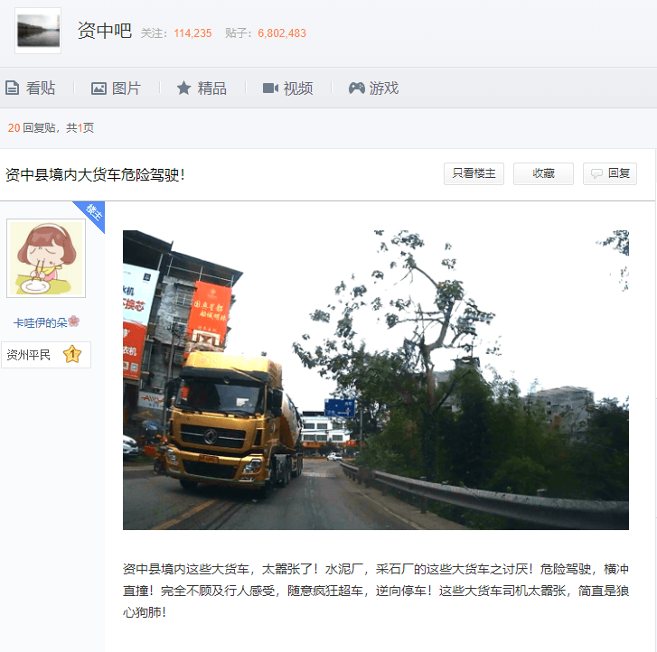 百度“資中吧”中一網(wǎng)友表示“資中縣境內(nèi)這些大貨車,太囂張了!水泥廠,采石廠的這些大貨車之討厭!危險(xiǎn)駕駛,橫沖直撞!完全不顧及行人感受,隨意瘋狂超車,逆向停車!這些大貨車司機(jī)太囂張,簡直是狼心狗肺!”