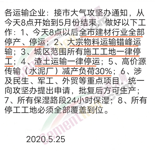 收到上述通知,區(qū)域內(nèi)各水泥企業(yè)陸續(xù)發(fā)出停產(chǎn)、停運(yùn)及暫時(shí)裝車的通知,并表示恢復(fù)時(shí)間不確定,將另行通知。輝縣市某水泥企業(yè)通知稱:輝縣市空氣質(zhì)量排名靠后,政府要求現(xiàn)在起至月底,停產(chǎn)停運(yùn),請(qǐng)各位客戶諒解。
