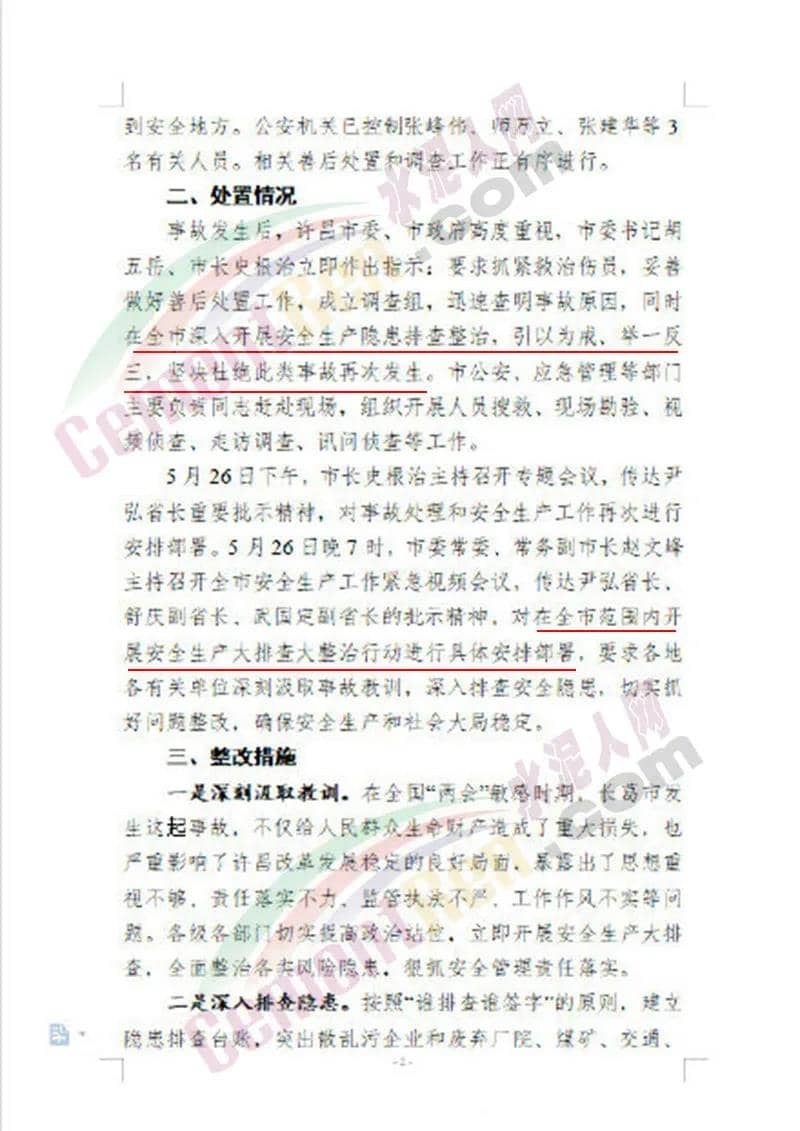 5月26日下午,市長史根治主持如開專題會議,傳達尹弘省長重要批示精神,對事故處理和安全生產(chǎn)工作再次進行安排部署。當時晚7時,市委常委,常務副市長趙文峰主持召開全市安全生產(chǎn)工作緊急視頻會議,傳達省領導批示精神,對全市范圍內開展安全生產(chǎn)大排查大整治行動進行具體安排部署,要求各地各有關單位深刻汲取事故教訓,深入排查安全隱患,切實抓好問題整改,確保安全生產(chǎn)和社會大局穩(wěn)定 。