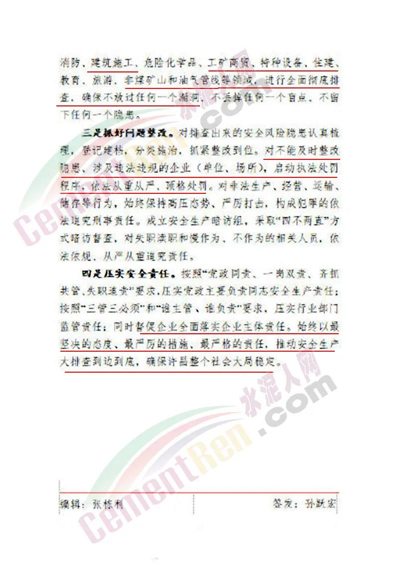 整改措施要求,按照“誰排查誰簽字”的原則,建立隱患排查臺賬,突出散亂污企業(yè)和廢棄廠院、煤礦、交通、消防、建筑施工、危險化學品、工礦商貿、特種設備、住建、旅游、非煤礦山和油氣管線等領域,進行全面徹底排查,確保不放過任何一個漏洞,不丟掉任何一個盲點,不留下任何一個隱患。對不能及時整改隱患,涉及違法違規(guī)的企業(yè),啟動執(zhí)法處罰程序 ,依法從重從嚴,頂格處罰。同時壓實安全責任,督促企業(yè)全面落實企業(yè)主體責任。始終以最堅決的態(tài)度 、最嚴厲的措施,最嚴格的責任,推動安全生產(chǎn)大排查到邊到底,確保許昌整個社會大局穩(wěn)定。文件原文如下: