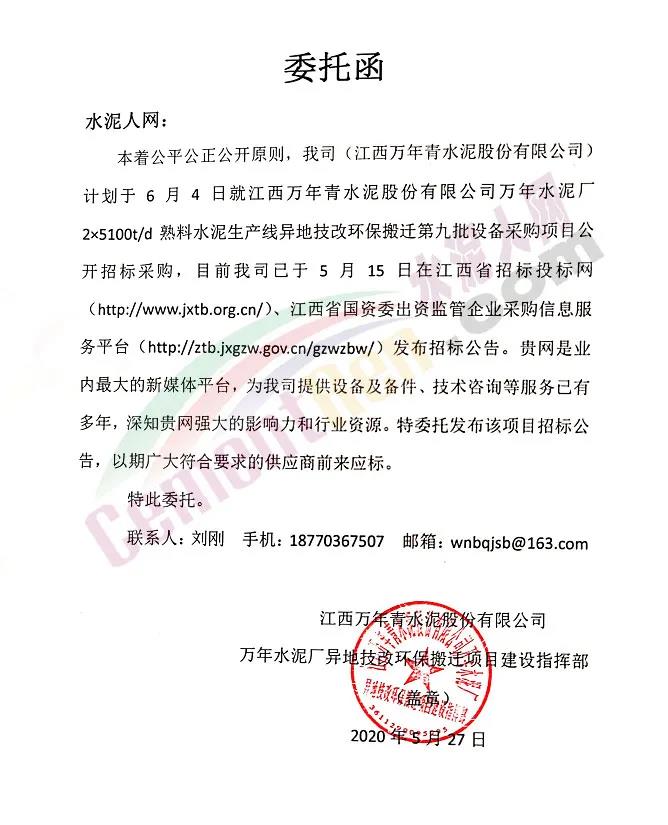 (招標編號:JXTC2020020143-001~008)江西萬年青水泥股份有限公司萬年水泥廠2×5100t/d熟料水泥生產(chǎn)線異地技改環(huán)保搬遷第九批設(shè)備采購項目進行國內(nèi)公開招標。有關(guān)事項公告如下: