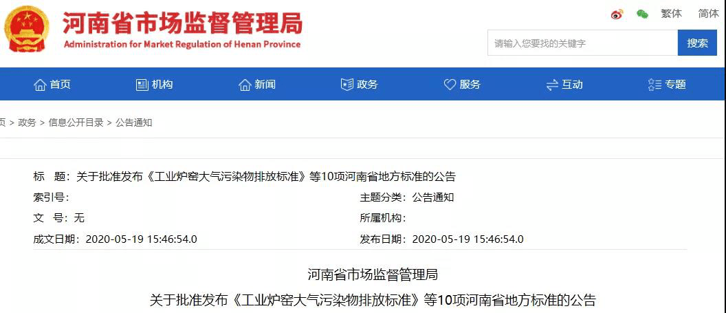 河南省工業(yè)爐窯大氣污染物排放標準將于6月1日起實施