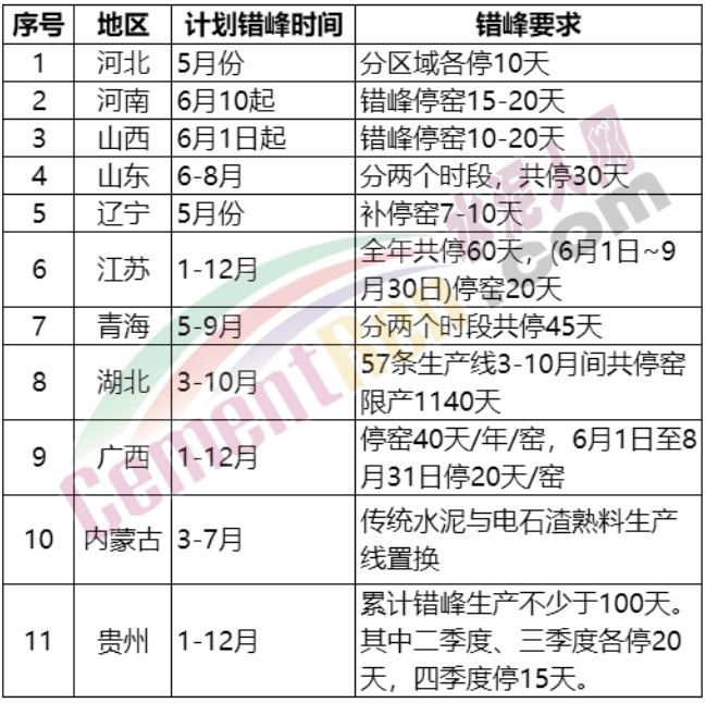近日,山東、山西、河南省通知區(qū)域內(nèi)水泥熟料生產(chǎn)線將于6月份開始錯峰生產(chǎn)。江蘇省通知熟料生產(chǎn)線于6月1日-9月30日停窯20天。廣西壯族自治區(qū)水泥協(xié)會通知2020年6月1日至8月31日停20天/窯。