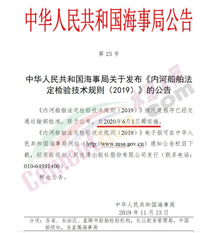 2019年11月20日,交通運輸部海事局發(fā)布了《內(nèi)河船舶法定檢驗技術(shù)規(guī)則(2019)》。規(guī)則針對我國內(nèi)河船長大于等于20米船舶設(shè)計建造、營運檢驗的技術(shù)法規(guī)進行了系統(tǒng)明確,同時對內(nèi)河船舶檢驗制度、安全與防污染技術(shù)要求等方面進行了全面、系統(tǒng)修訂。有關(guān)負責人表示,規(guī)則的發(fā)布實施將對我國內(nèi)河船舶航行安全以及環(huán)境保護起到積極促進作用。該規(guī)則將于2020年6月1日起正式實施。