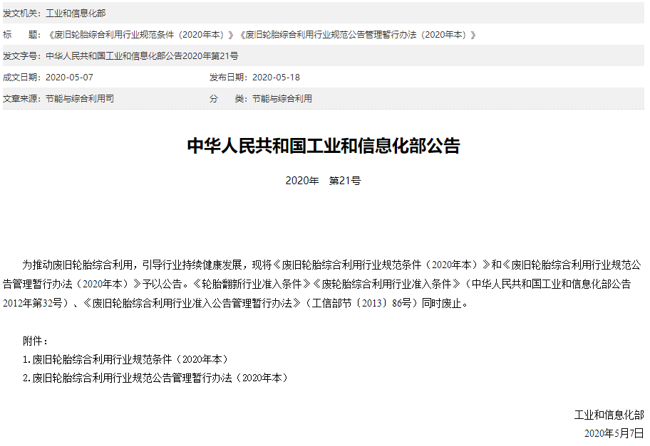 為推動廢舊輪胎綜合利用,引導(dǎo)行業(yè)持續(xù)健康發(fā)展,工業(yè)和信息化部日前公告《廢舊輪胎綜合利用行業(yè)規(guī)范條件(2020年本)》和《廢舊輪胎綜合利用行業(yè)規(guī)范公告管理暫行辦法(2020年本)。