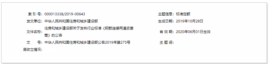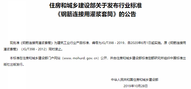還有一件大事要關(guān)注:那就是住房和城鄉(xiāng)建設(shè)部發(fā)布了關(guān)于《鋼筋連接用灌漿套筒》的公告,批準由中國建筑科學研究院主編的《鋼筋連接用套筒灌漿料》為建筑工業(yè)行業(yè)產(chǎn)品標準,編號為JG/T408-2019,自2020年6月1日起實施。