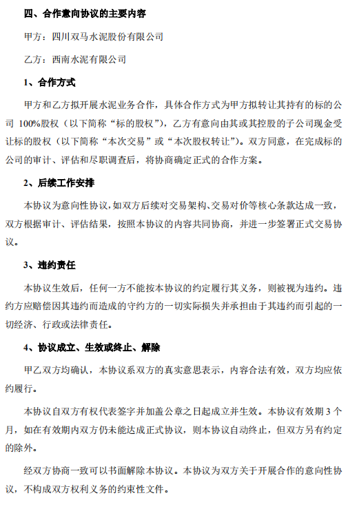 公告特別提示稱(chēng):四川雙馬水泥股份有限公司已于 2020 年 5月 29 日與西南水泥有限公司簽署了《合作意向協(xié)議》。公司擬轉(zhuǎn)讓所持有的遵義礪鋒水泥有限公司100%股權(quán) 。