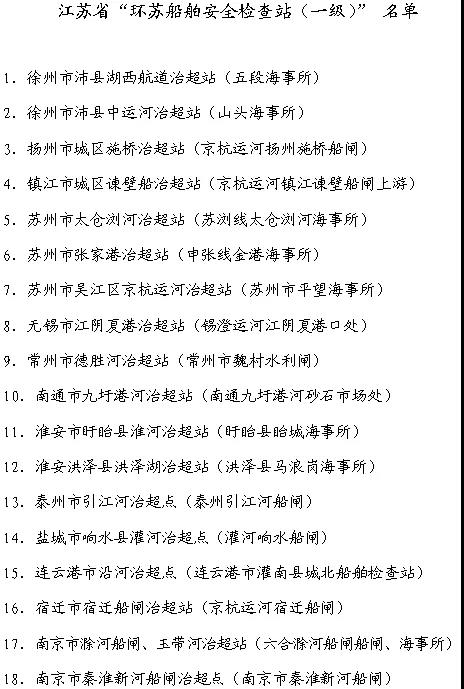 江蘇省將在省際相鄰水域、京杭運河沿線和通江口門等處建立18個“江蘇省環(huán)蘇船舶安全檢查站(一級)”作為“治超站”(名單附后),對過往船舶實施現(xiàn)場檢查。對外省擬進(jìn)入我省內(nèi)河水域的超載超限船舶,各檢查站點要采取勸返、驅(qū)離的方式,禁止此類船舶進(jìn)入我省內(nèi)河水域。