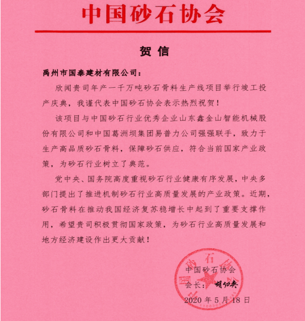 開業(yè)儀式上,棗莊鑫金山智能裝備有限公司董事長(zhǎng)孫中巖以中國(guó)砂石協(xié)會(huì)副會(huì)長(zhǎng)單位名義宣讀中國(guó)砂石協(xié)會(huì)胡幼奕會(huì)長(zhǎng)賀信。首先,胡會(huì)長(zhǎng)在賀信中指出,對(duì)禹州市國(guó)泰建材有限公司年產(chǎn)一千萬(wàn)噸砂石骨料生產(chǎn)線項(xiàng)目竣工投產(chǎn)表示祝賀。并表示,該項(xiàng)目致力于生產(chǎn)高品質(zhì)砂石骨料,保障砂石供應(yīng),符合當(dāng)前國(guó)家產(chǎn)業(yè)政策,為砂石行業(yè)樹立了典范。