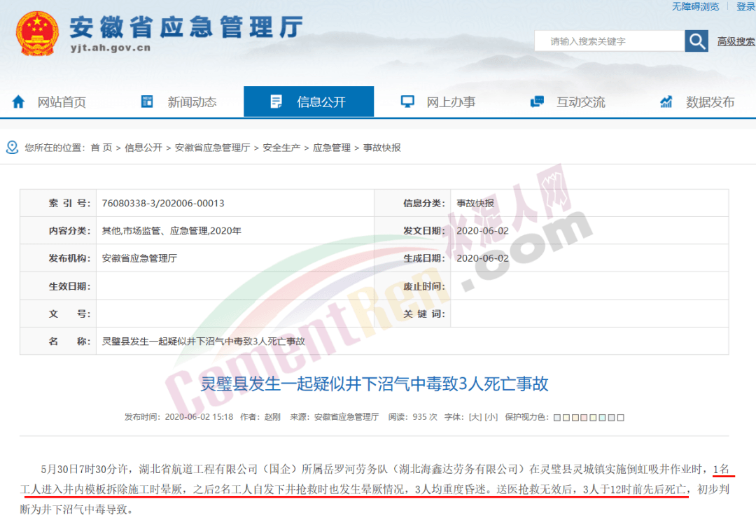 據(jù)安徽省應(yīng)急管理廳網(wǎng)站消息,5月30日,靈璧縣發(fā)生一起疑似井下沼氣中毒致3人死亡事故。5月30日7時30分許,湖北省航道工程有限公司(國企)所屬岳羅河勞務(wù)隊(duì)(湖北海鑫達(dá)勞務(wù)有限公司)在靈璧縣靈城鎮(zhèn)實(shí)施倒虹吸井作業(yè)時,1名工人進(jìn)入井內(nèi)模板拆除施工時暈厥,之后2名工人自發(fā)下井搶救時也發(fā)生暈厥情況,3人均重度昏迷。送醫(yī)搶救無效后,3人于12時前先后死亡,初步判斷為井下沼氣中毒導(dǎo)致。