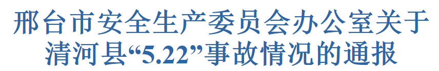 邢臺市安全生產(chǎn)委員會辦公室 于5月23日對該事故進(jìn)行了通報邢臺市安全生產(chǎn)委員會辦公室關(guān)于清河縣“5.22”事故情況的通報提到,清河縣這起較大事故暴露出我市一些地方和單位在堅(jiān)守安全生產(chǎn)紅線、底線方面存在較大差距。