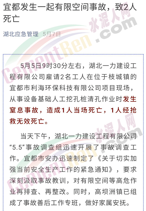 湖北省應(yīng)急管理廳官方微信發(fā)布消息:2020年5月5日9時30分左右,湖北一力建設(shè)工程有限公司雇請2名工人在位于枝城鎮(zhèn)的宜都市利海環(huán)??萍加邢薰卷?xiàng)目現(xiàn)場,從事設(shè)備基礎(chǔ)人工挖孔樁清孔作業(yè)時發(fā)生窒息事故,造成1人當(dāng)場死亡,1人經(jīng)搶救無效死亡。
