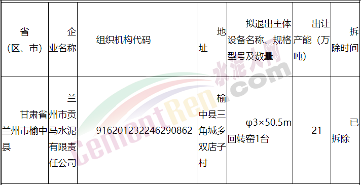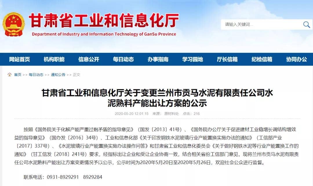 圖:蘭州市貢馬水泥有限責(zé)任公司21萬(wàn)噸/年(800噸/日)產(chǎn)能出讓公示