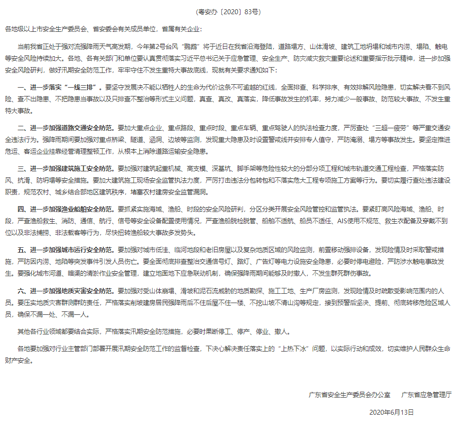 6月13日,廣東省安委辦、省應(yīng)急管理廳就進(jìn)一步加強汛期安全防范工作發(fā)出通知,要求各地、各有關(guān)部門和單位要進(jìn)一步加強安全風(fēng)險研判,做好汛期安全防范工作,各地要加強對行業(yè)主管部門部署開展汛期安全防范工作的監(jiān)督檢查,牢牢守住不發(fā)生重特大事故底線。