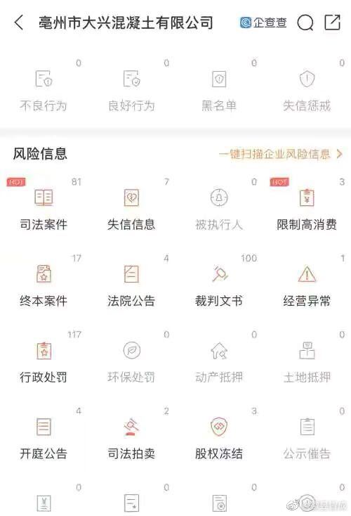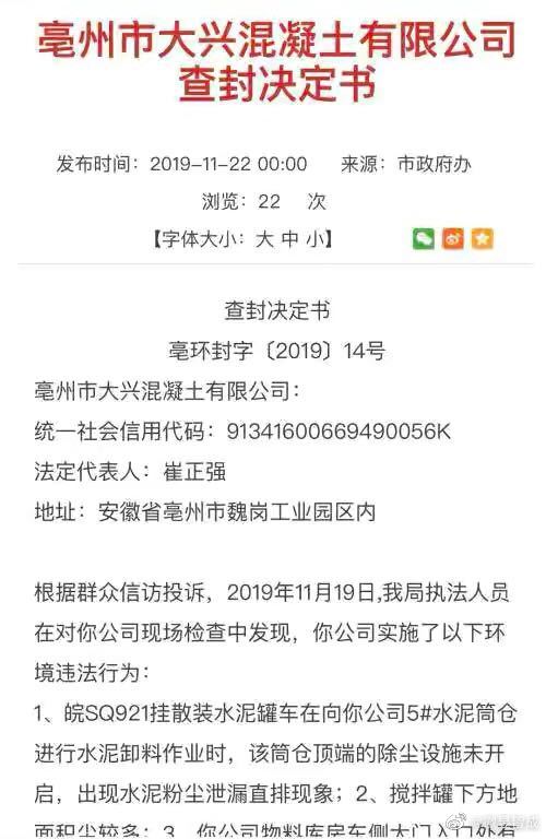 企查查提示:亳州市大興混凝土有限公司法人代表為崔正強(qiáng),該公司因?yàn)檫`反大氣污染防治管理制度和機(jī)動(dòng)車違反禁令標(biāo)志等違法違規(guī)行為,曾被行政處罰高達(dá)117次。