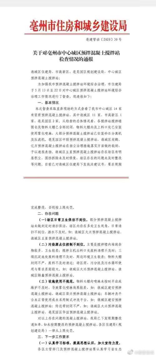 2020年5月22日,亳州市住建局經(jīng)過檢查核實(shí),對(duì)中心城區(qū)混凝土攪拌站下達(dá)(亳建管函2020第30號(hào))檢查情況通告。