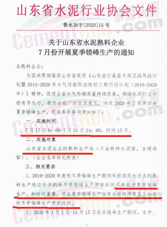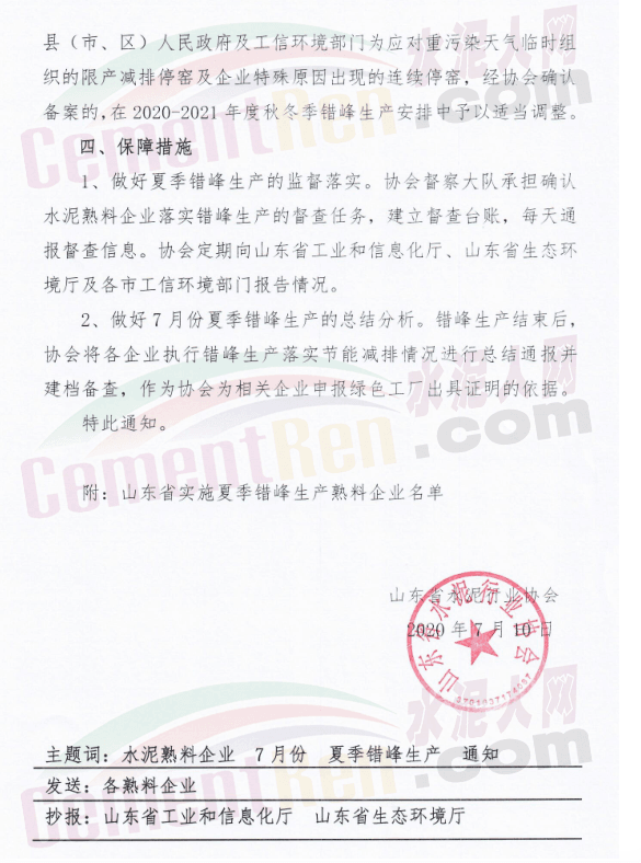 據(jù)水泥人網(wǎng)消息,近日,山東省水泥行業(yè)協(xié)會(huì)發(fā)布《關(guān)于山東省水泥熟料企業(yè)7月份開(kāi)展夏季錯(cuò)峰生產(chǎn)的通知》稱:為堅(jiān)決貫徹落實(shí)山東省政府《山東省打瀛藍(lán)天保衛(wèi)戰(zhàn)作戰(zhàn)計(jì)劃暨2013-2020年大氣污染防治規(guī)劃三期行動(dòng)計(jì)劃(201-2020年)》精神,促進(jìn)全省大氣環(huán)境質(zhì)量持續(xù)改善,確保水泥行業(yè)平穩(wěn)有序運(yùn)行,山東省水泥協(xié)會(huì)決定2020年7月份實(shí)施夏季錯(cuò)峰生產(chǎn),具體通知如下: